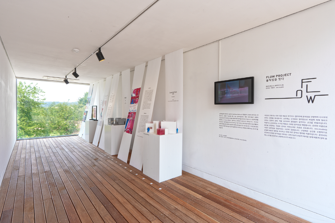 세 팀의 건축가들은 서로 다른 재료로 루프리스 갤러리에 움직임을 구현하며 시시각각 변하는 풍경을 제시하고 있습니다. 손주휘 건축가는 규격화된 컬러칩으로 바람에 의해 열리고 닫히는 건축적 경계, 벽을 설치하며 끊임없이 움직이는 공간을 만들어냅니다. 이용주 건축가는 금속이라는 무거운 재료로 바람의 가벼운 움직임을 재현하고 있습니다. 유연한 흐름으로 공간을 유영하는 작품은 관객의 자연스러운 흐름을 유도합니다. AnLstudio는 사람의 움직임을 만들어내는 시선에 집중합니다. 단열재로 공간을 수평적으로 분할해 새로운 장면을 제시하고 이에 따른 관객의 행위를 이끌어내고 있습니다. 관객은 콘크리트 공간에서 다양한 움직임을 지어내는 건축가들의 상상과 해석을 통해 새롭게 살아 숨쉬는 공간을 온몸으로 경험해 볼 수 있을 것입니다.