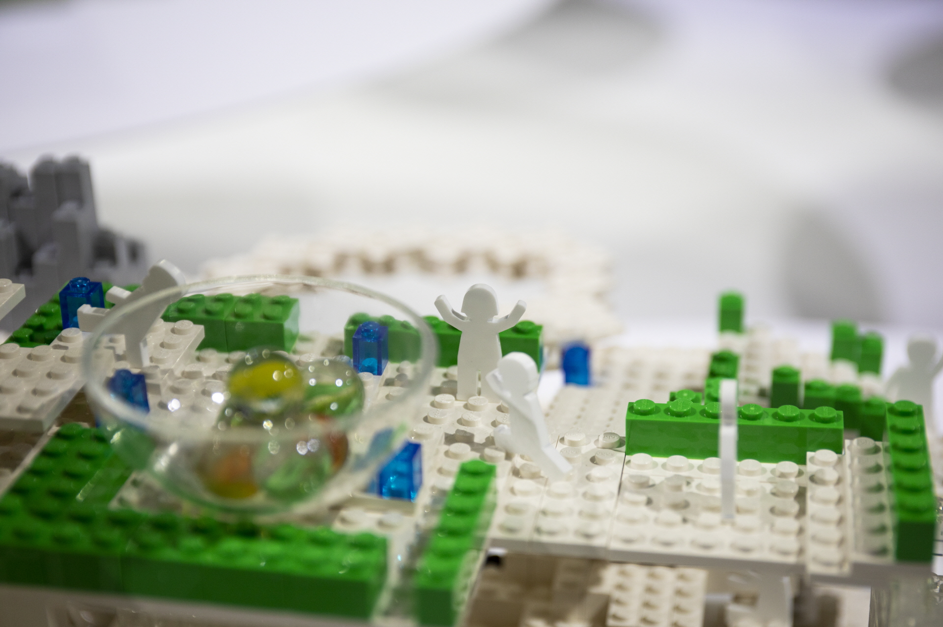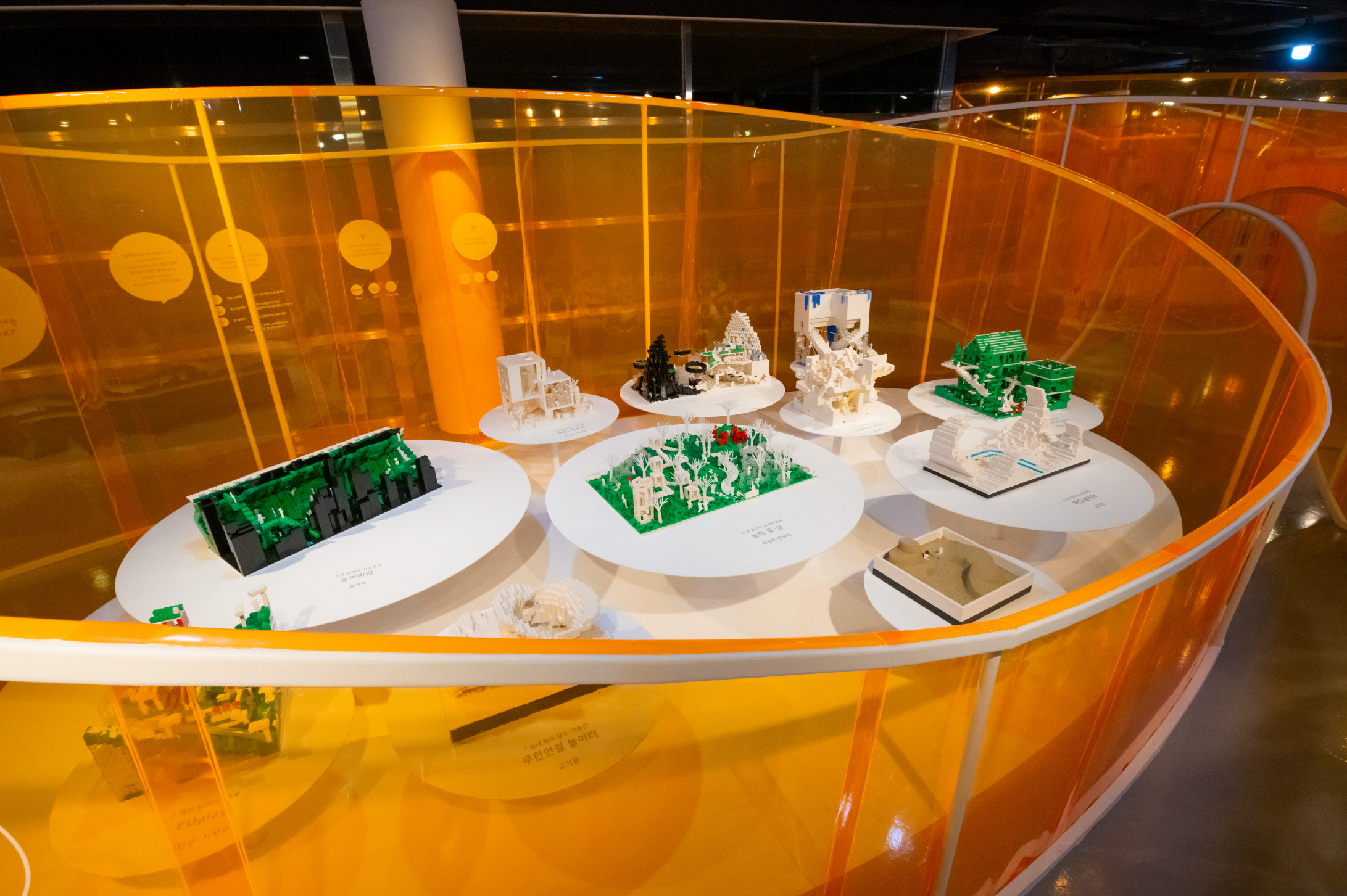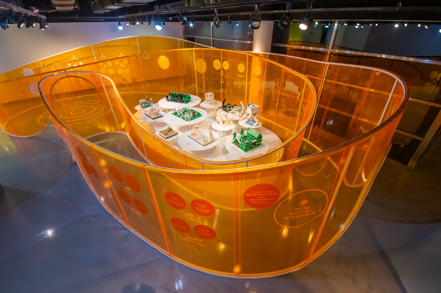 ≪다 같이 놀자, 동네 세 바퀴≫는 요즘 어린이들의 놀이에 대한 생각을 들어보는 데서 시작됩니다. 그리고 어린이들의 놀이 환경을 지켜줄 수 있는 동네를 만들기 위한 어른들의 고민을 들어봅니 다. 어린이들이 뛰어놀기 좋은 동네, 놀세권의 개념과 기준을 제시한 연구를 바탕으로 5팀의 엄마 아빠 건축가(고기웅, 권형표, 전보림·이승환, 서민우·지정우, 홍경숙)가 ‘뛰어놀기 좋은 동네’를 장난감 브릭Brick으로 구현했습니다. 건축가에 의해 지어진 11개의 놀이터는 유기적으로 연결되어 하나의 이상적인 놀세권의 모습을 보여줍니다. 이후 어린이들은 우리 동네의 놀이 환경을 자가 진단해보고, 이를 바탕으로 친구들과 더 즐겁게 뛰어놀기 위해서는 어떤 환경이 필요한지 브릭으로 자유롭게 상상해보고 다른 친구들과 공유해 보는 체험을 이어나갑니다.