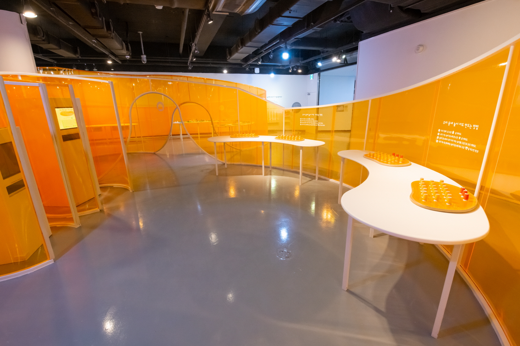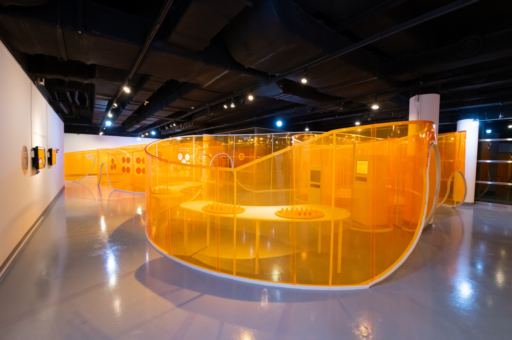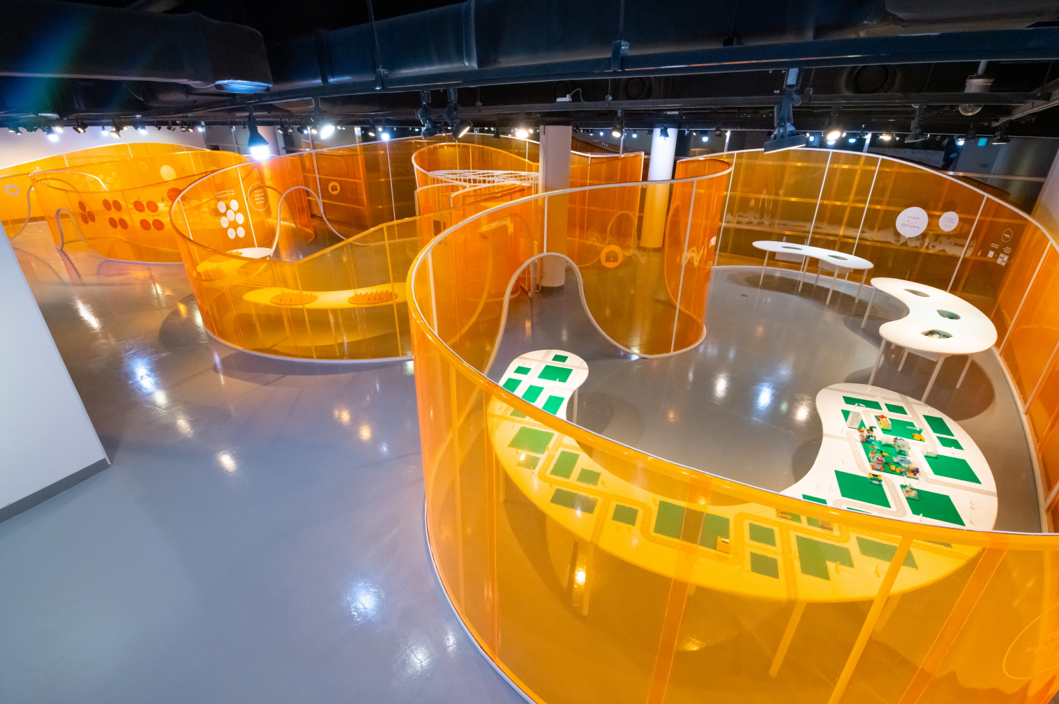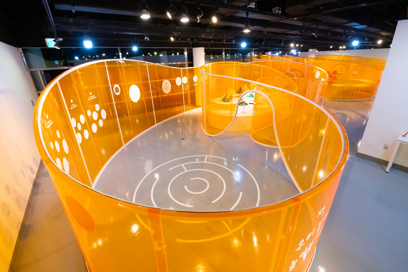 전시 공간은 어린이들이 공간적 상상력을 자극하는 미로 컨셉으로 이루어졌습니다. 투명한 네온색의 파빌리온은 곡선의 흐름을 가지고 전시 공간을 유기적으로 연결하고 있습니다. 어린이들은 전시 공간을 탐험하며 친구들과 자연스럽게 만나고 다양한 놀이 장소를 발견하면서, 작은 동네를 산책하듯이 전시 공간을 체험할 수 있습니다. 나아가 이번 전시는 경기도어린이박물관이라는 공간이 어린이들에게 뛰어놀 수 있는 열린 ‘동네 놀이 장소’가 될 수 있도록, 어린이 자문단과 함께 만든 <뭐 하고 놀지? 요즘 어린이들이 추천하는 바깥놀이 30>과 야외 공간에서 사용할 수 있는 다목적 놀잇감 <내 손안의 놀이터>를 선보이며 어린이들의 놀이를 응원합니다.