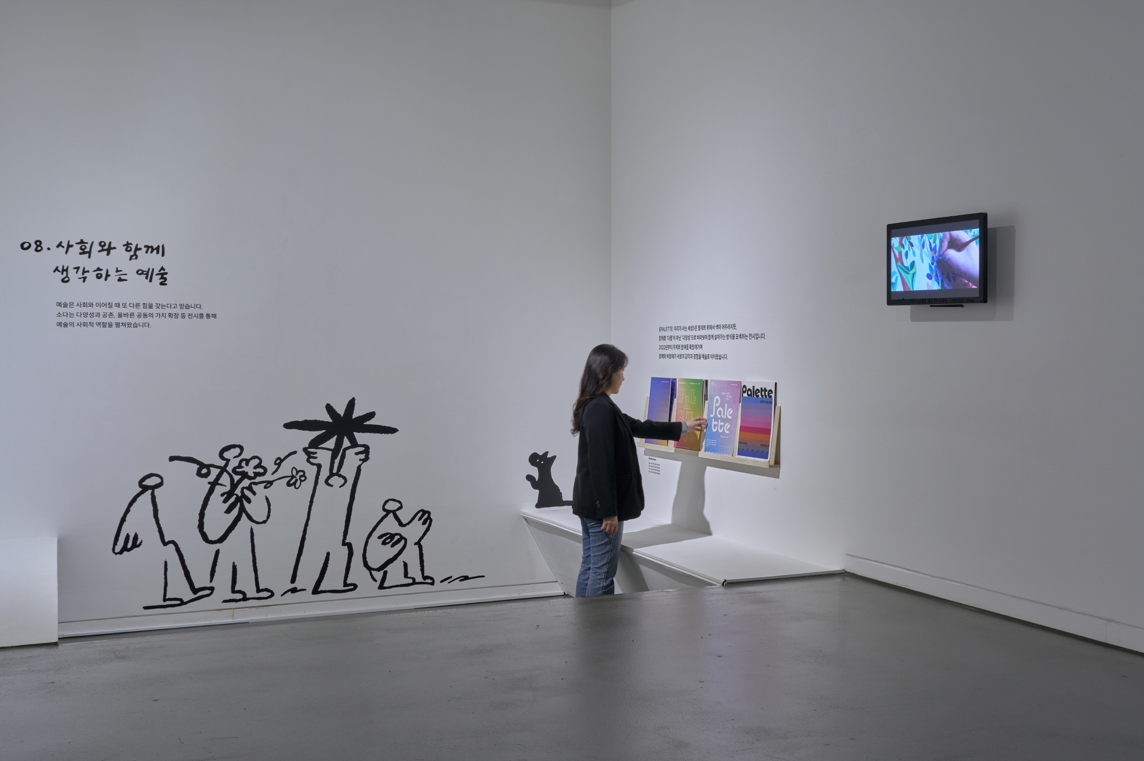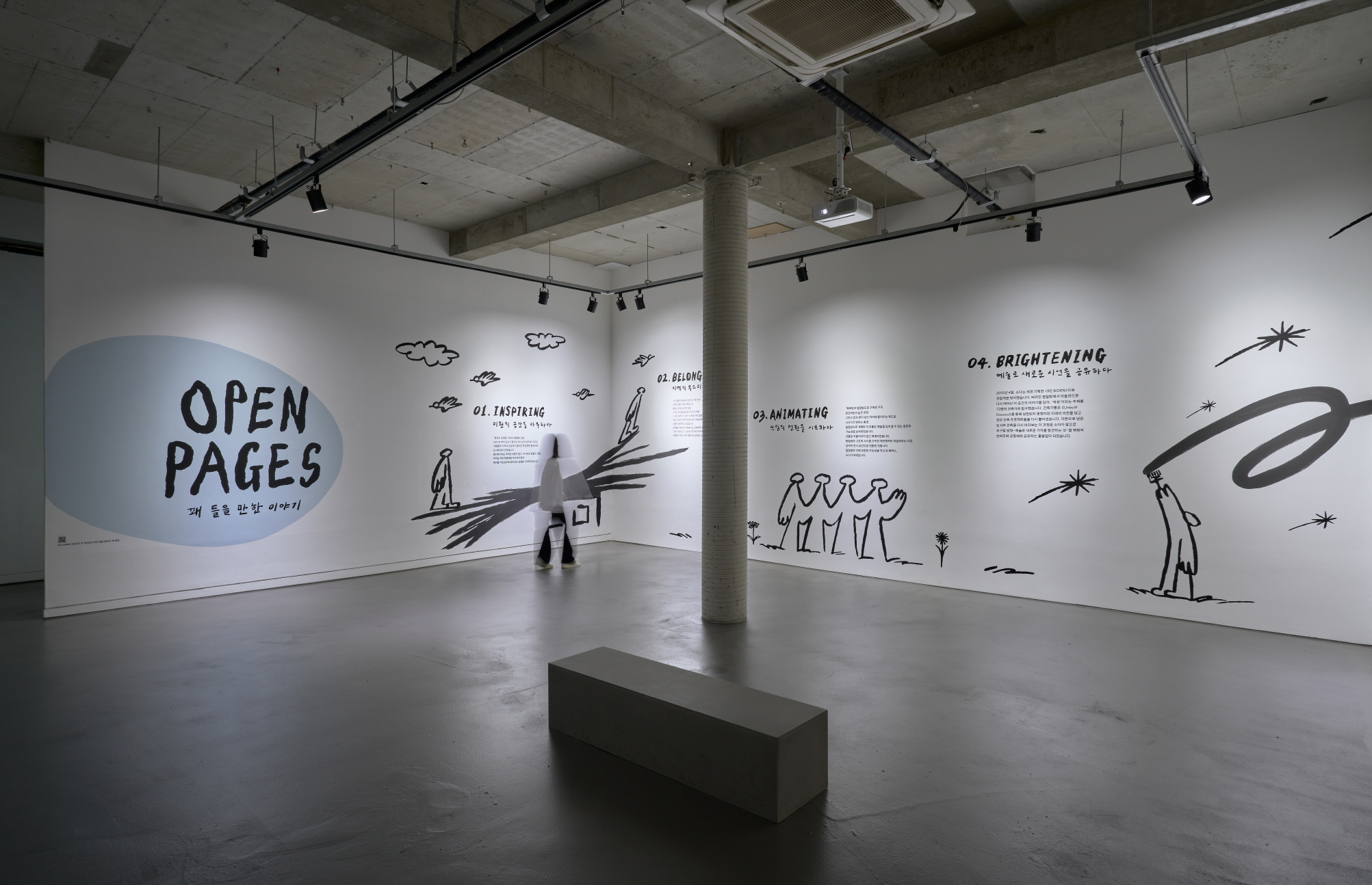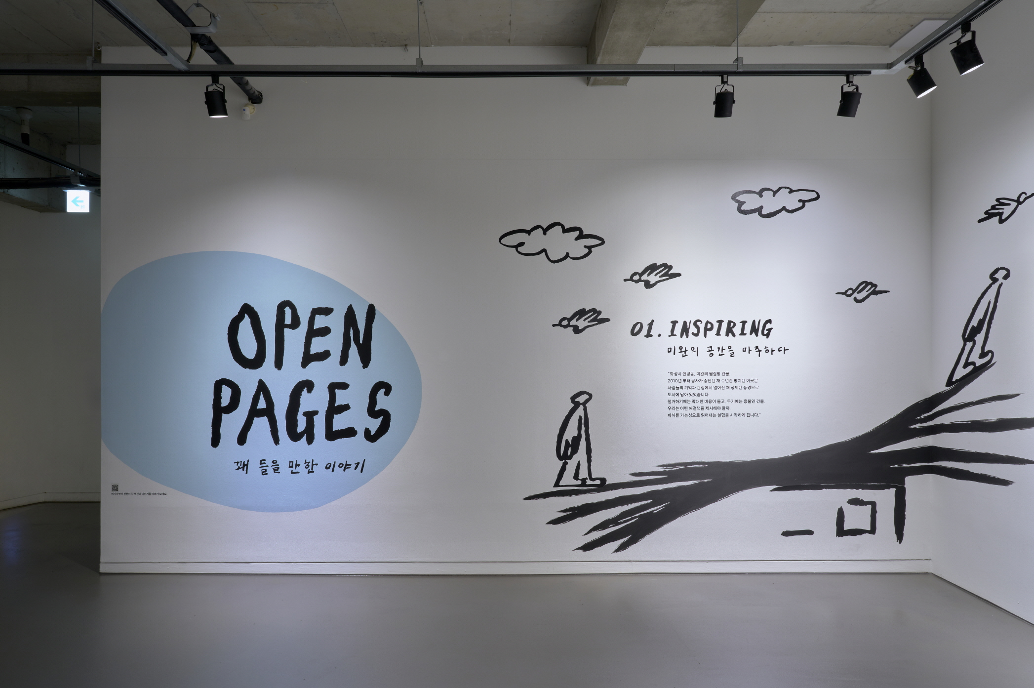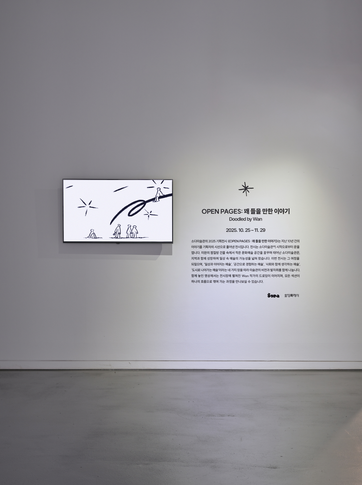 전시는 소다미술관의 시작으로부터 문을 엽니다. 미완의 찜질방 건물 속에서 작은 문화예술 공간을 꿈꾸며 태어난 소다미술관은, 지역과 함께 성장하며 일상 속 예술의 가능성을 넓혀 왔습니다. 이번 전시는 그 여정을 되짚으며, ‘일상과 이어지는 예술’, ‘공간으로 경험하는 예술’, ‘사회와 함께 생각하는 예술’, ‘도시로 나아가는 예술’이라는 네 가지 장을 따라 미술관의 비전과 발자취를 함께 나눕니다. 함께 놓인 영상에서는 전시장에 펼쳐진 Wan 작가의 드로잉이 이어지며, 모든 섹션이 하나의 흐름으로 엮여 가는 과정을 만나보실 수 있습니다.